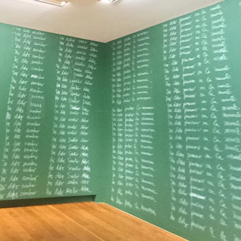 La exposición también reúne obras presentadas en importantes bienales. El cuarto de aislamiento, por ejemplo, fue su propuesta para la Bienal de Venecia de 2001. Más tarde, en la Bienal de Pontevedra de 2010, presentó una instalación en la que las paredes cubiertas de pizarras reproducían el castigo escolar de escribir mil veces una frase. Pero aquí, las oraciones eran prohibiciones impuestas a la mujer: “no debo hablar”, “no debo discutir”, “no debo guardar secretos”.